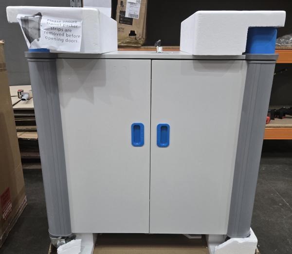 The UniCabby 32 Horizontal charges 32 Devices up to 14inch screen size Chromebooks, laptops and tablets including protective cases.With horizontal storage shelves with a built-in cable management system.It is fast and flexible with simultaneous charging and a programmable timer.Provides maximum security & safety with a dual point locking system and separate lockable power compartment.This unit is easy to move as it has ergonomic top handles, rounded corner bumpers and multi-directional non-marking wheels.It has silent charging with a unique ventilation system and a built-in heat sensor.With Support for Life with Limited Lifetime Warranty (5 years electrical), shipped fully assembled.